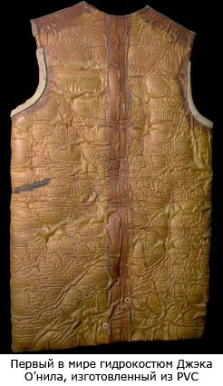 Работая с большим количеством разнообразных пеноматериалов, О’Нил познал свой первый успех с помощью поливинилхлорида (PVC), обладающего хорошими изолирующими свойствами. Первый “мокрый” костюм был изготовлен им именно из поливинилхлорида с пластиковыми вставками.