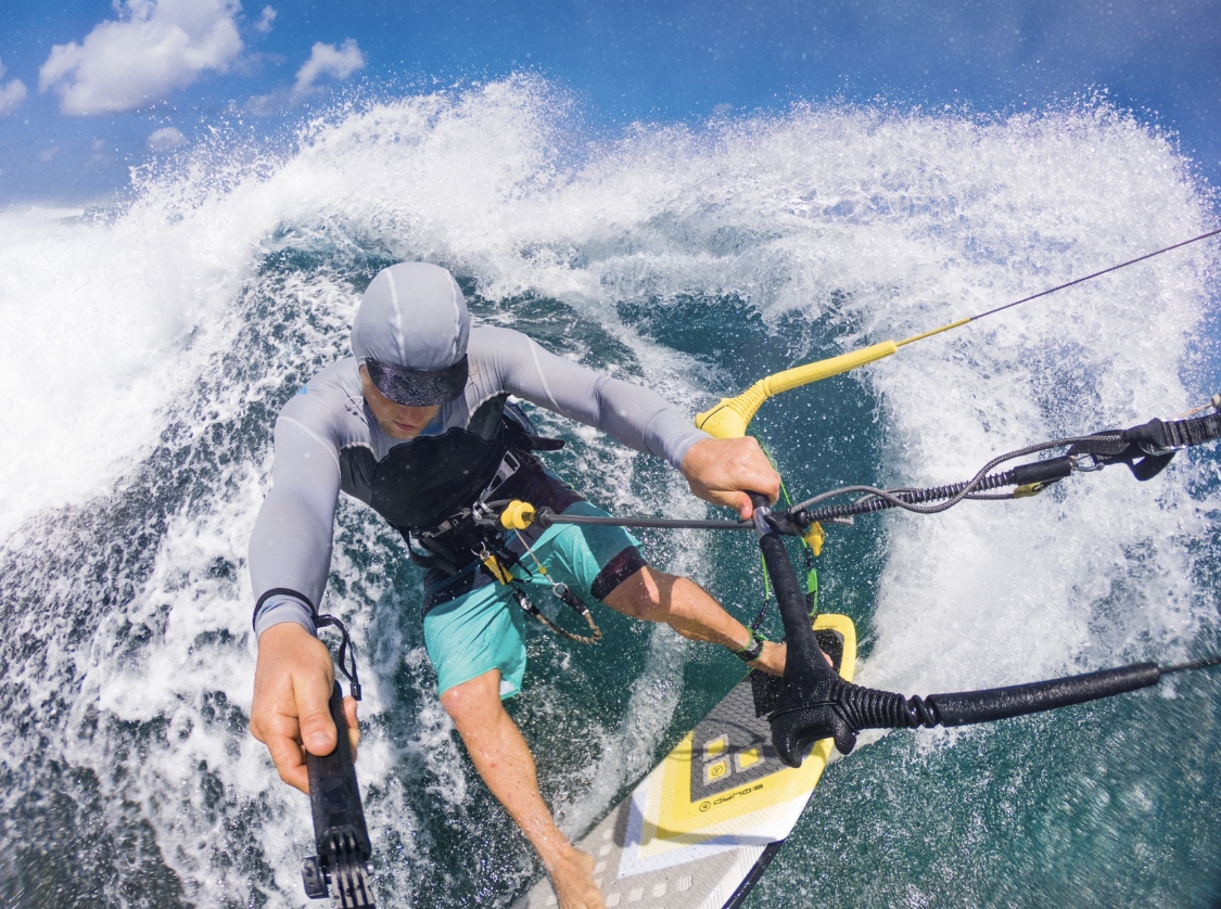 Берём динамическую фотографию, где зафиксирована вода в движении. Например, здесь я делаю поворот на гребне волны и вода летит в стороны из-под доски.