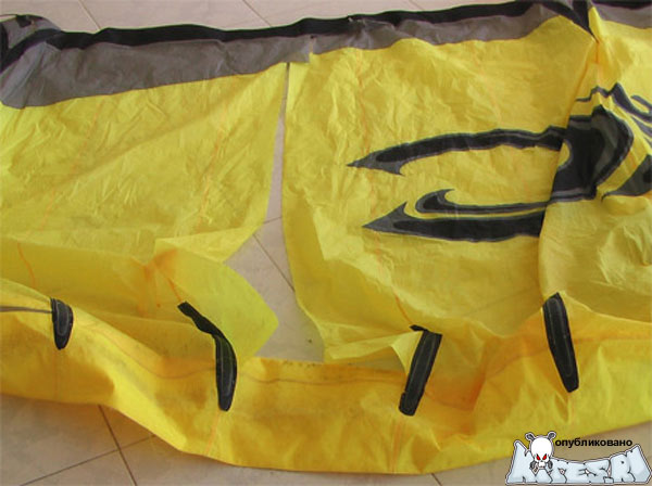 При ударе об воду не редки случаи, когда кайт рвется пополам, и линия разрыва при этом проходит близко ко шву, которым купол пришит к центральному баллону.