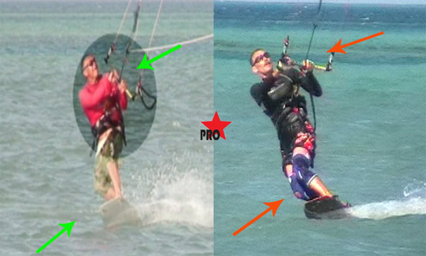 2. Положение доски, а точнее опорного края доски, во многом определяет амплитуду прыжка, чем больше по длине опорный край доски будет в воде, тем лучше контроль над доской, и тем большую тягу кайта можно использовать для прыжка. Справа из-за переноса веса тела назад доска на половину вышла из воды, уменьшая эффективную длину ребра доски (то, что находится в воде), ухудшая контроль на доской перед отталкиванием и не позволяя развить необходимую тягу кайтом.