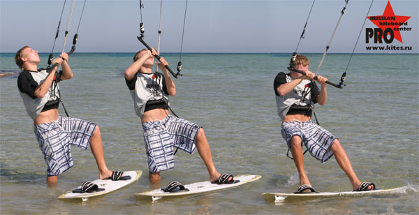 – отводим кайт в противоположную движению сторону, почувствовав тягу, откидываемся в трапеции, и резко переводим кайт по направлению движения, вставляя вторую ногу в петлю.