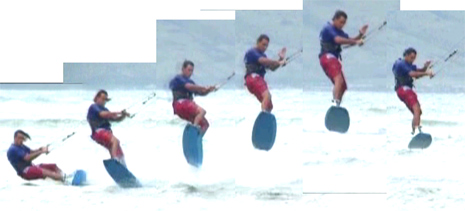 На кайте приходится постоянно упираться, чтобы сохранить тягу кайта и контролировать доску, как правило, всегда есть неровности от чопа до волны. А толкаться с загруженных ног получается не всегда. Поэтому перед толчком необходимо чуть выпрямиться, расслабляя ноги ставя доску чуть плоско, возвращая контроль, если ее бьет по волне и сразу сильно упереться, сгибая колени. Это зарезание не должно быть слишком долгим. Толчок больше похож на удар хвостом доски. Толкаясь, перенесите вес тела на заднюю ногу, направляя нос доски на ветер, подтягивая разгруженную переднюю ногу вверх. Вы как будто продлеваете толчок, оставляя хвост доски в воде. При этом прыгать надо от кайта, прогибаясь, откидывая плечи назад. Позвольте кайту подхватить вас, по другом я бы сказал не надо бороться с кайтом, сильно откидываясь назад и виса на планке. Вы прыгаете за счет доски.