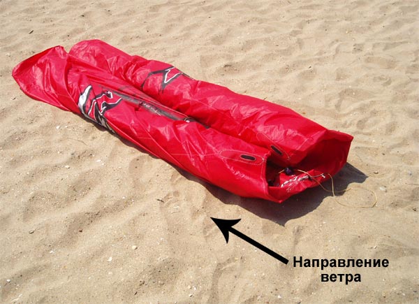 1. Выберите свободное чистое место. Подальше от людей, деревьев, кустов, ЛЭП, строений и прочего в радиусе 100 м или больше. Если рядом находятся другие райдеры, убедитесь, что Ваш купол, планка и разложенные стропы никому не будут мешать. Убедитесь, что размер Вашего кайта подходит под Ваш вес и под текущие ветровые условия (см. инструкция к кайту). Достаньте кайт из чехла и положите его баллонами вверх, передним баллоном перпендикулярно направлению ветру.