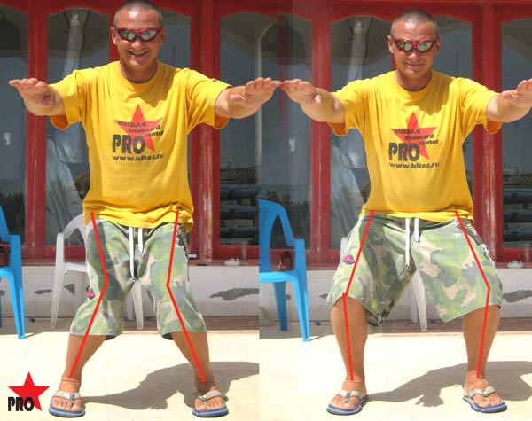 – вес тела распределен равномерно на обе ноги;