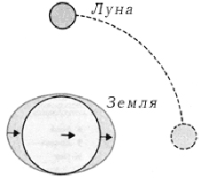 Гравитационное притяжение Земли, действующее на Луну и удерживающее ее на околоземной орбите, противоположно силе притяжения Земли Луной, которая стремится сместить Землю по направлению к Луне и «приподнимает» все объекты, находящиеся на Земле, в направлении Луны.