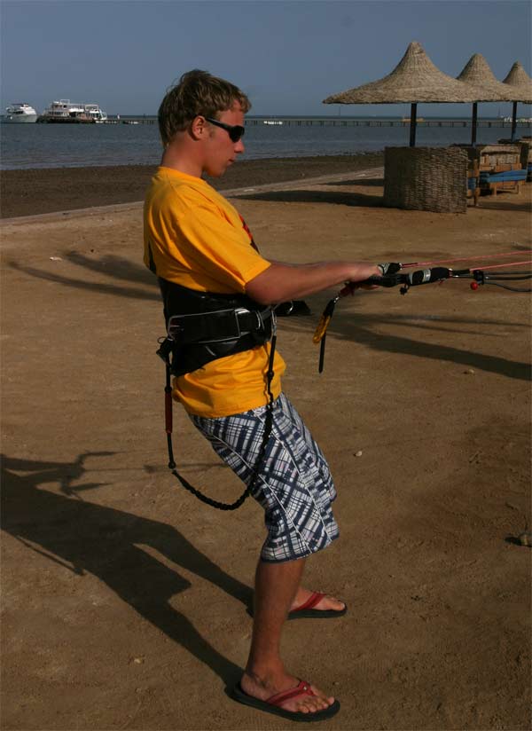 Держите спину прямо (поясницу) не позволяйте кайту согнуть вас. Колени чуть согнуты, все тела на пятках.