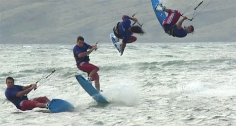 Настоящий Front Flip. Очень важно максимально загрузить фал при вылете. Для этого, зарезаясь, максимально загружаем хвост доски. Для чего перенесите вес на вашу заднюю ногу и сильно упритесь. На вылете, достигнув максимума, используйте натяжение веревки, чтобы задать вращение. Тяните ручку к вашему животу и наклоните голову так, чтобы ваш подбородок коснулся груди. Как только началось вращение, отпустите вашу заднюю руку, это облегчит вращение и поможет не запутаться в веревке. Теперь все, что вы должны сделать, это сконцентрироваться на приземлении. Попробуйте снова взяться задней рукой и сгибайте колени, смягчая приземление.